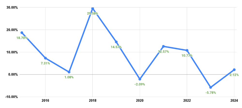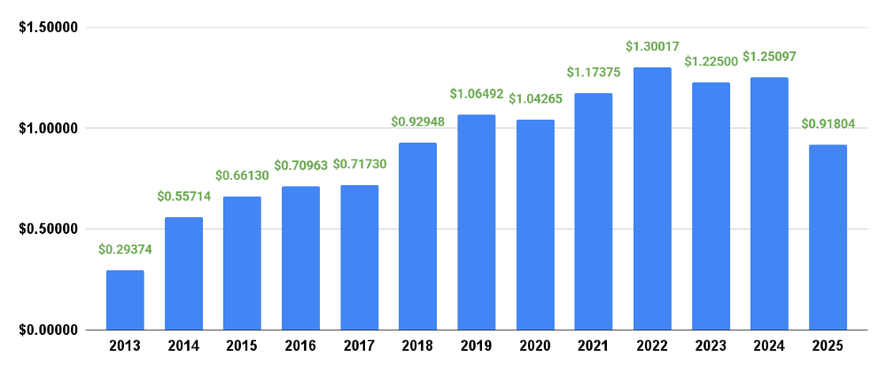 下のグラフはDGRW設定来から2025/9までの年間分配金推移です、ちなみに2013年は7か月分しかないので、ちょっと少なめになってます(DGRWの設定が2013/5のためです)。
