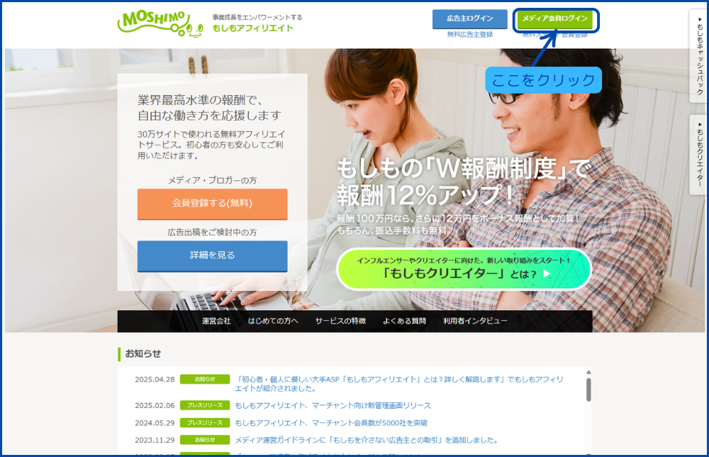 では実際にやってみましょう、まずはもしもアフィリエイトへログインします、もしもアフィリエイトのトップページ右上にある、「メディア会員ログイン」をクリックしてみましょう。