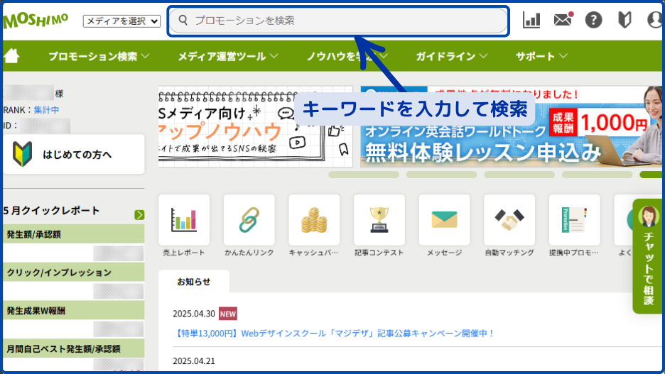 ログイン後のトップページが表示されます、貼りたい広告が決まっている場合は、検索の部分へキーワードを入力して探すことができます。