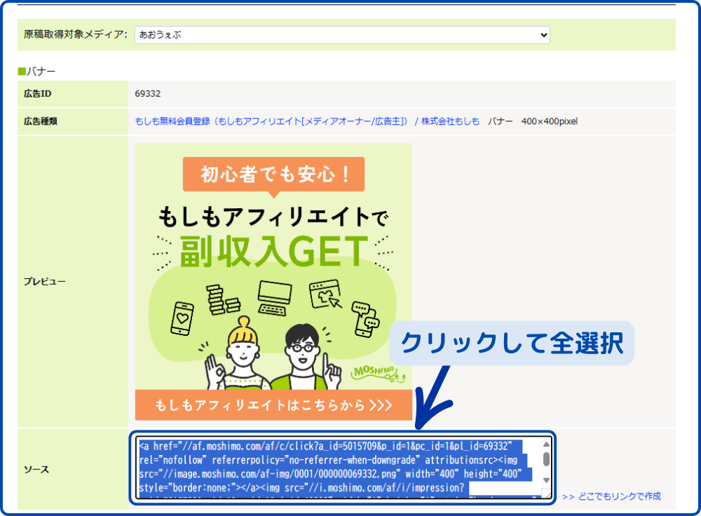 広告リンクの一覧が表示されるので好きな広告を選んでください、今回は例としてバナー広告を貼りつけていきます、ソースの項目にあるなにやら難しそうな文字列が広告コードになっているので、これをコピーします。