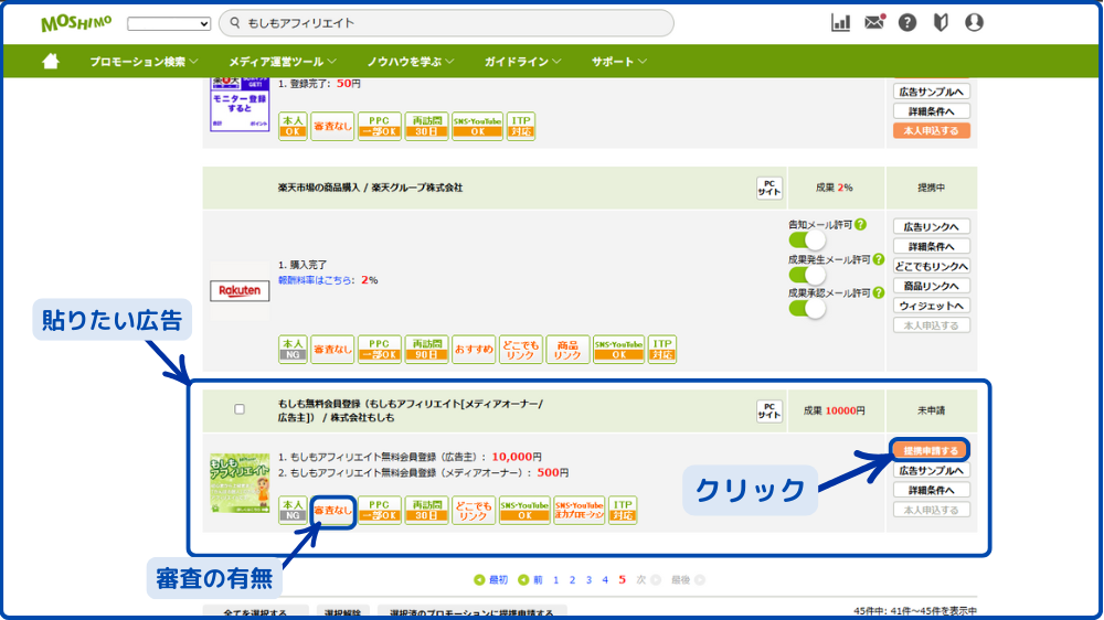 今回は「もしもアフィリエイト」で検索してみます、検索結果が表示されるので、自分の貼りたい広告が見つかったら、右側にある「提携申請」をクリックしましょう。