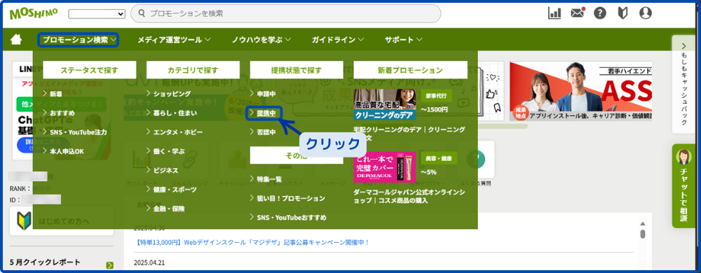 「プロモーション検索」のなかの「提携中」をクリックすると、現在提携しているプロモーションが表示されます。
