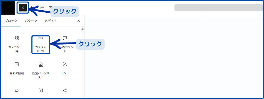 記事投稿画面の左上にある「+マーク」をクリックすると、ブロックの一覧が表示されるので、その中にある「カスタムHTML」をクリックします。