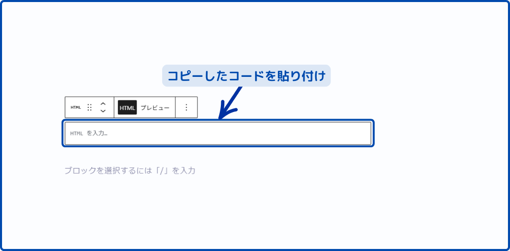 カスタムHTMLのブロックが追加されます、このブロックにコピーしたコードを貼りつけていきます、ブロックを選択した状態でCtrlキーを押しながらVキーを押します。