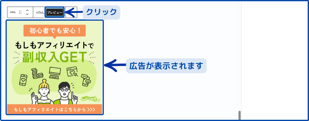 コードを入力した状態だとただの文字列ですが、プレビューをクリックすると広告が表示されます、記事を公開すると実際にこのような表示になります。