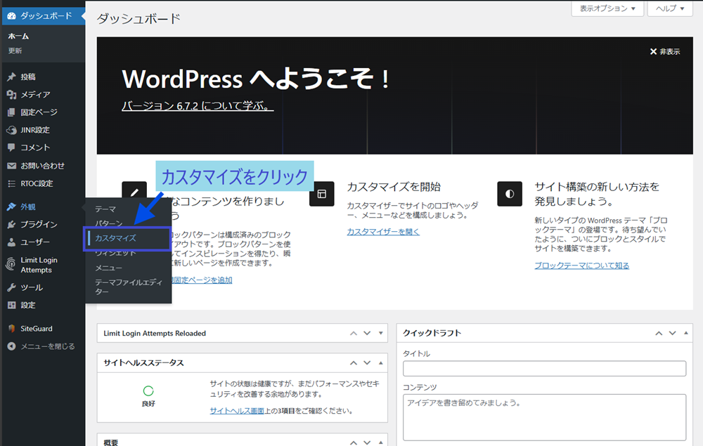 ・まずは、WordPressのホーム画面左側にある、外観メニューからカスタマイズをクリックします。
