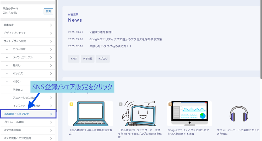 ・カスタマイズメニューにある、SNS登録/シェア設定をクリックします。