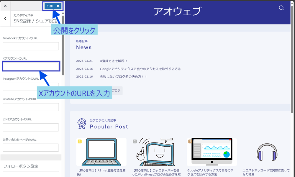 ・XアカウントのURLの部分に、アカウントURLを入力し、公開をクリックします。